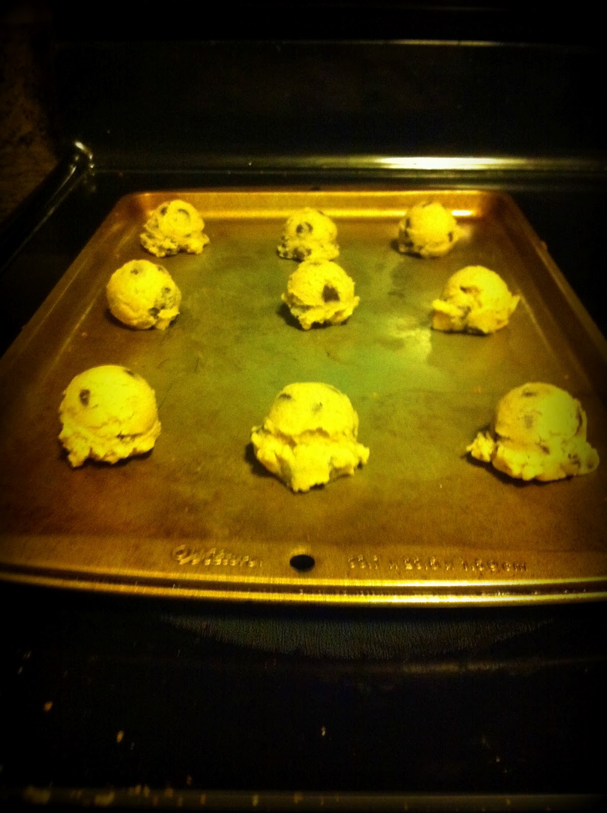 Take a small ice cream scoop and drop cookie dough balls onto ungreased pans.